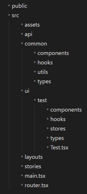 그래서 features 기반으로 그룹화(페이지, 컴포넌트, 훅, 스토어 등)하여 사용하게 되는데, 이를 기반으로 React 프로젝트 구조를 아래와 같이 구축해보자. Vue 도 마찬가지로 다를게 없다고 생각한다.